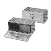 Skrzynia została wykonana z aluminiowej blachy ryflowanej (grubość = ok. 2mm) i posiada gumową uszczelkę obwodową. Skrzynia wyposażona jest w 1 uchwyt z zintegrowanym zamkiem, dwa zawiasy i jeden łańcuch.