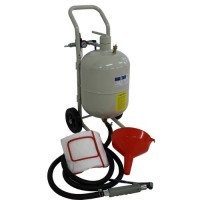 Wyposażony w zawór odcinający, manometr, dysze ceramiczne, wąż, lejek do napełniania, syfon, 6 '' koła gumowe i hełm piaskarski