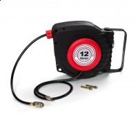 Nigdy więcej potknięć na porozrzucanych wężach. Praktyczny 12m wąż sprężonego powietrza w stabilnej obudowie do montażu ściennego z obracanym uchwytem o 180°. Należy wyciągnąć wybraną długość węża, zostanie on zablokowany i pozostanie w wybranej pozycji. Po pracy wystarczy lekko pociągnąć wąż, a zwinie się on automatycznie.